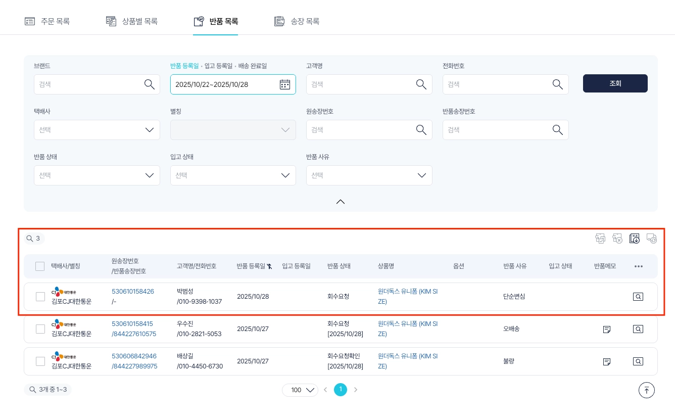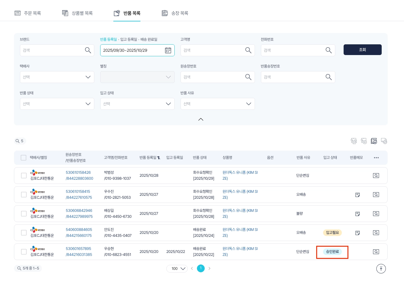 반품목록 탭 선택 - 반품등록된 내용 확인