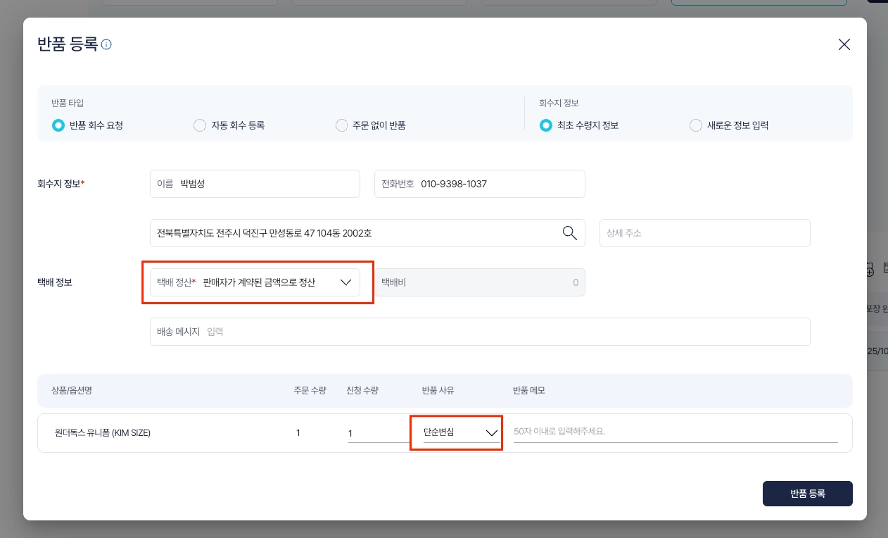 택배정보 ⇒ 택배 정산 ‘판매자가 계약된 금액으로 정산’선택 및 단순변심 선택