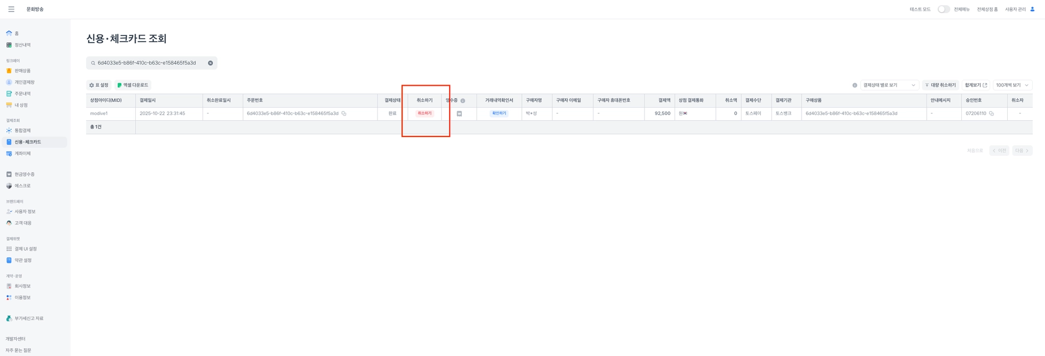(입고상태 승인 완료 후)토스 페이먼츠 접속 ⇒ 결제조회 > 신용체크카드 선택